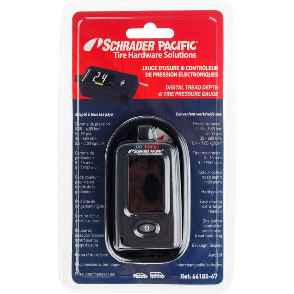 Digitální pneuměřič a hloubkoměr dezénu pneumatik SCHRADER pro všechny typy vozů.