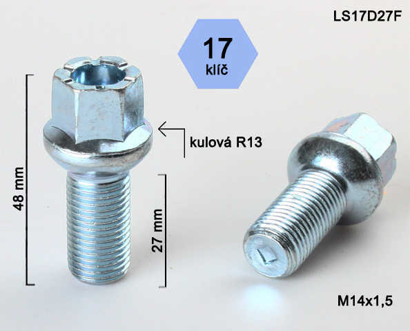 Šrouby na alu kola a plechové disky M14x1,5x27mm koule R13 dosedací plocha.